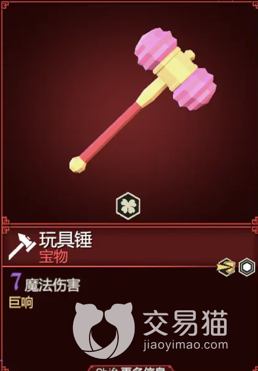 玩具锤,在红色武器中也是奇葩的一个。其基础只有七点的魔法伤害,甚至不如一把白装的小刀。且带有巨响效果,是一个具有特殊用途的武器。