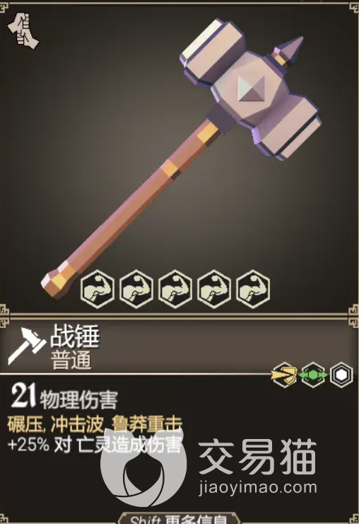战锤,双手锤21点的物理伤害,并带有碾压和冲击波效果。且附带25%的对亡灵伤害提升,在打骷髅怪的时候非常的有用,一锤子下去能死一片骷髅。