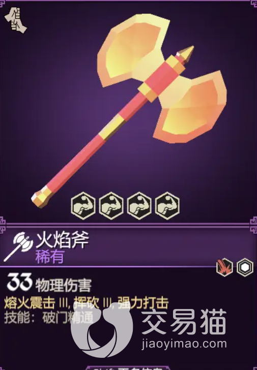 火焰斧,游戏中最好的斧头之一。在某些情况下,比红斧头还要有用。33点物理伤害并带上了三级的熔岩震击和三级的挥砍,并且还自带技能破门精通,要伤害有伤害,要功能有功能,特别好用。