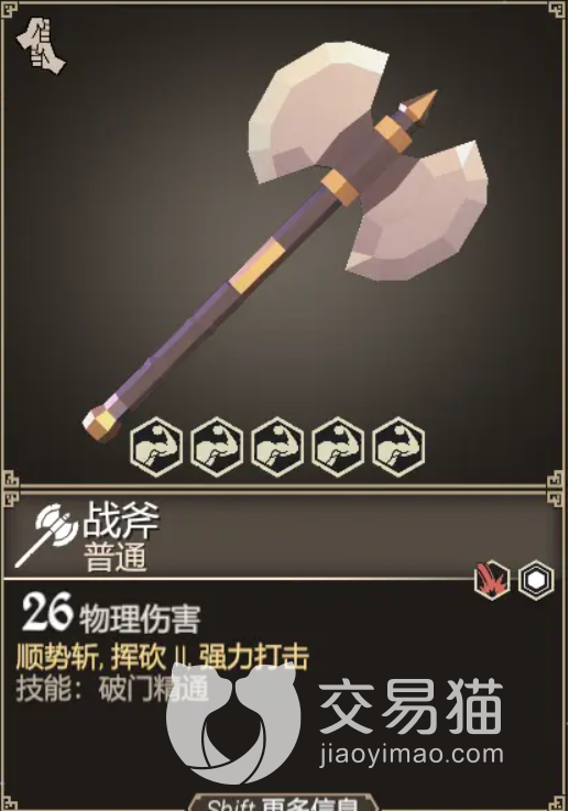 战斧,这把武器是所有白装斧头武器当中最好用的了。26点的物理伤害,并带两级挥砍以及技能破门精通,在清理障碍以及伤害能力方面都有自己的用处。