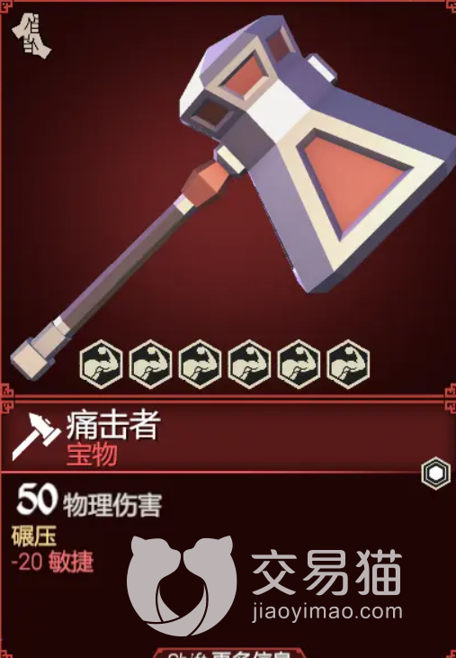 痛击者双手重锤,顾名思义是游戏中力量属性最高的重锤武器。有着游戏中顶级的50点伤害加成,且附带一个碾压效果。不过也因此,虽然伤害很高,但是会对力量要求苛刻,减少了20点的玩家敏捷,不常用。