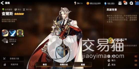 一技能拥有概率追加二技能的特性,二技能的伤害随自身强化效果数量增加,三技能则是敌方数量越少伤害越高。毫无疑问,查尔斯是一位拥有强烈输出意愿的骑士。与夏绿蒂这位输出战士角色相比,查尔斯在技能上偏向输出,但拥有更好的血防性能,同时还具备出色的功能性。三技能为全队提供增益效果,二技能能清除目标所有强化效果。一追二的机制与神器大宝剑的效果完美契合。只要查尔斯在竞技场上,就透露出一股“我队友,你别碰”的气场,给队友满满的安全感。这使得查尔斯在输出和肉盾方面都具有极强的干扰性,成为让对方头痛不已的竞技场角色。
