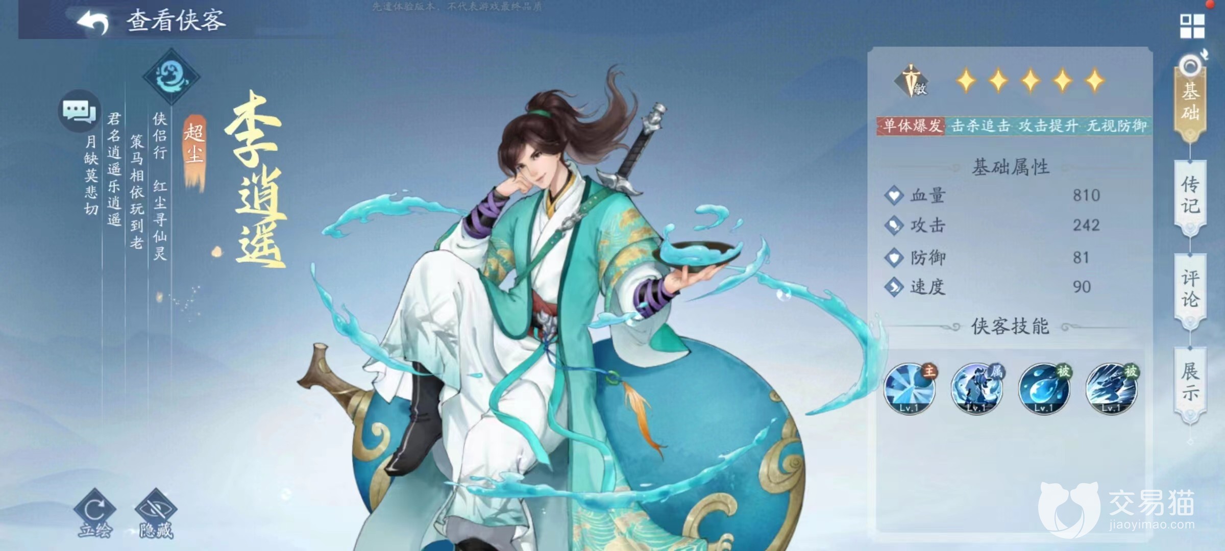 李逍遥这个角色在游戏里面输出还行,最擅长的就是虐菜了,但如果和同等战力的角色相比较起来,其实并没有什么太大的特色的地方,前期的话其实不太推荐使用,但是后期如果是玩家要去寻仙路,亦或者是去挑战装备的话,还是可以让他去虐一下菜的。