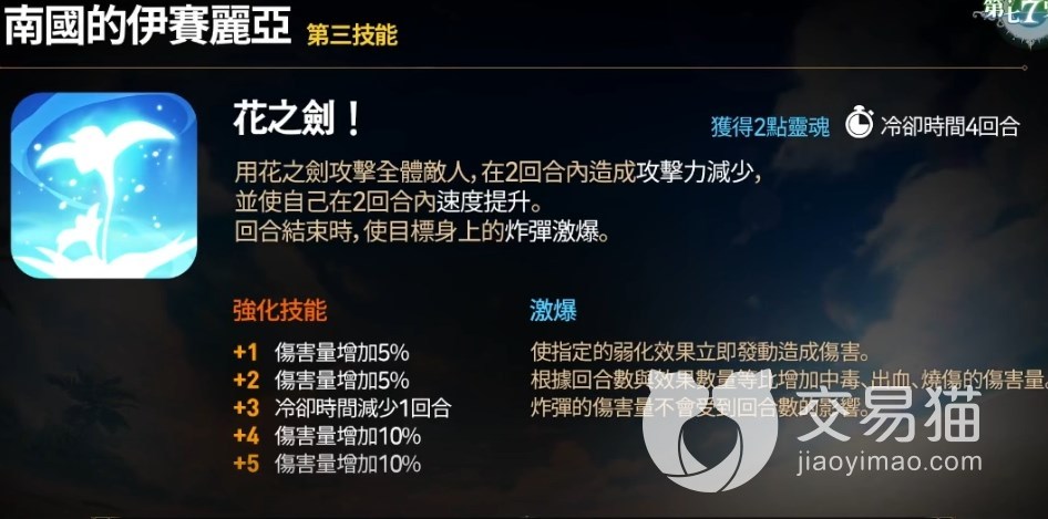 S3全体攻击,2回合内降低敌人攻击,提升自己速度,并且在回合结束的时候,让目标所携带的炸弹效果发生“激爆”。但需要注意的是激爆是在回合结束的时候才结算,如果对面有光泰、急救水琴、反击水琴等角色的时候,对方是可以先驱散炸弹的。