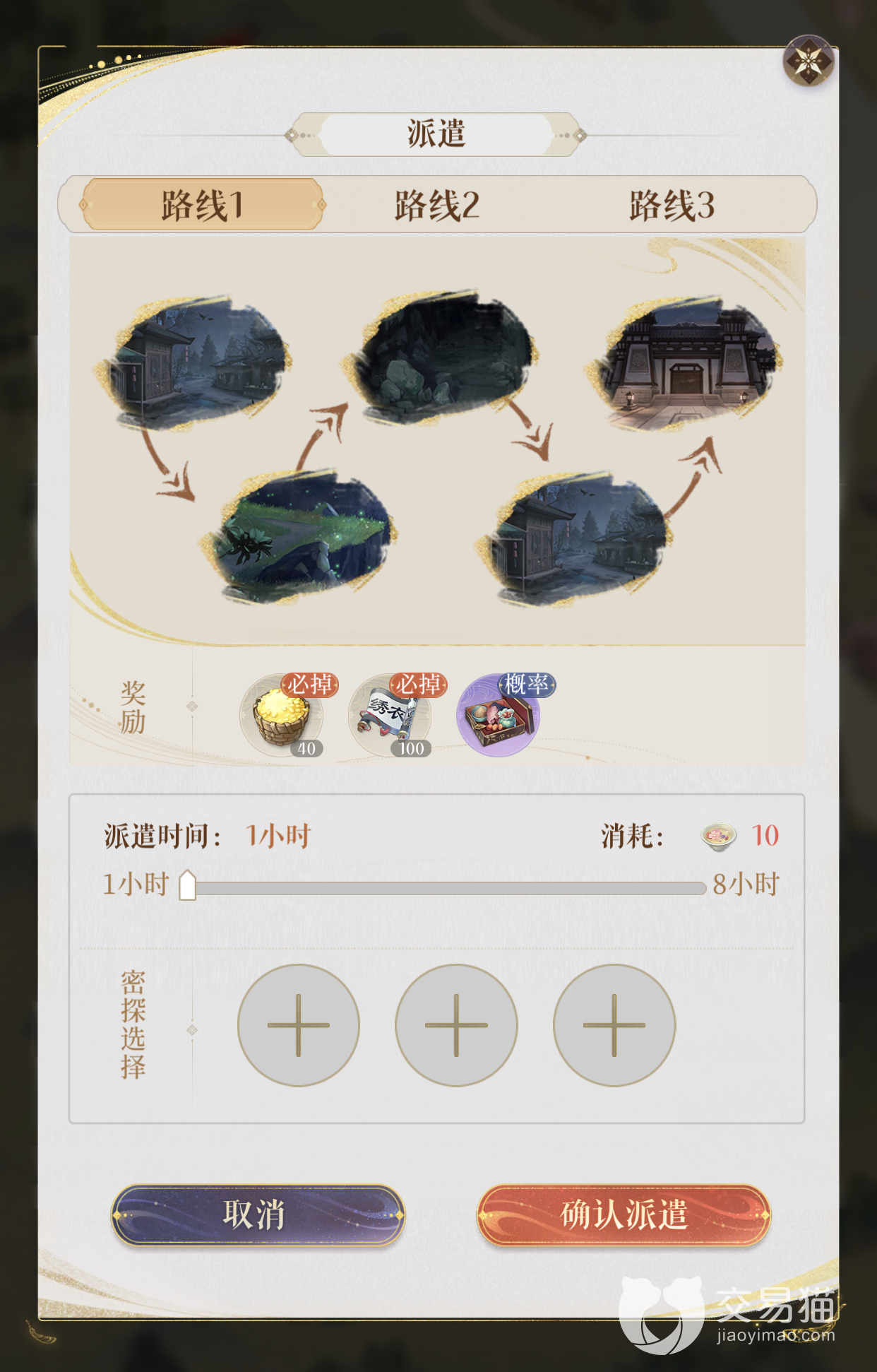 而在游戏中,获得鸢食最轻松的渠道就是据点派遣,玩家们可以通过鸢食礼包获得大量鸢食或者白金币,派遣的时间可以自由选择一到八小时,时间越久获得的道具越多。如果掉落了茱萸道具,不仅可以解锁意外事件,还能获取到五十白金币,但是茱萸道具的掉落概率较低,且需要注意的是,玩家们只有在雒阳进行据点派遣时才能获取鸢食礼包,一定要选择路线一。