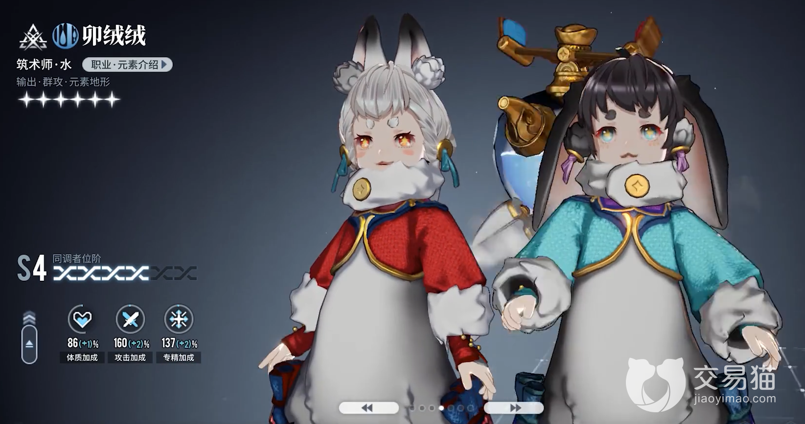 卯绒绒——作为版本幻神的存在,卯绒绒属于一个拥有必养的角色,她的立绘外表虽然是两个可爱软萌的小兔子姐妹,但是战斗力和她们的外表是相反的存在,她们的技能除了可以造成大量的伤害之外,还可以在场上形成水元素区域,因为游戏内的伤害机制让该角色可以利用技能让自身的伤害增加,简单来说,就是必备的角色。