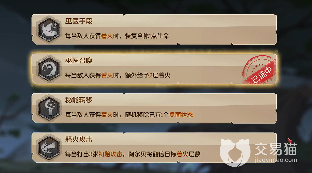 专属天赋方面,所有的专属天赋都可以给予敌方大量的火焰属性的附加伤害,例如巫医手段,当敌人着火的时候可以恢复全体我方单位一点生命值。或者巫医召唤,当敌人着火的时候额外再给两层着火。也就是说,我们用它配合火焰系的卡牌,走火焰的爆发流派,又或者选他的生命缠绕走火走无限流派,都是相当适合的选择。