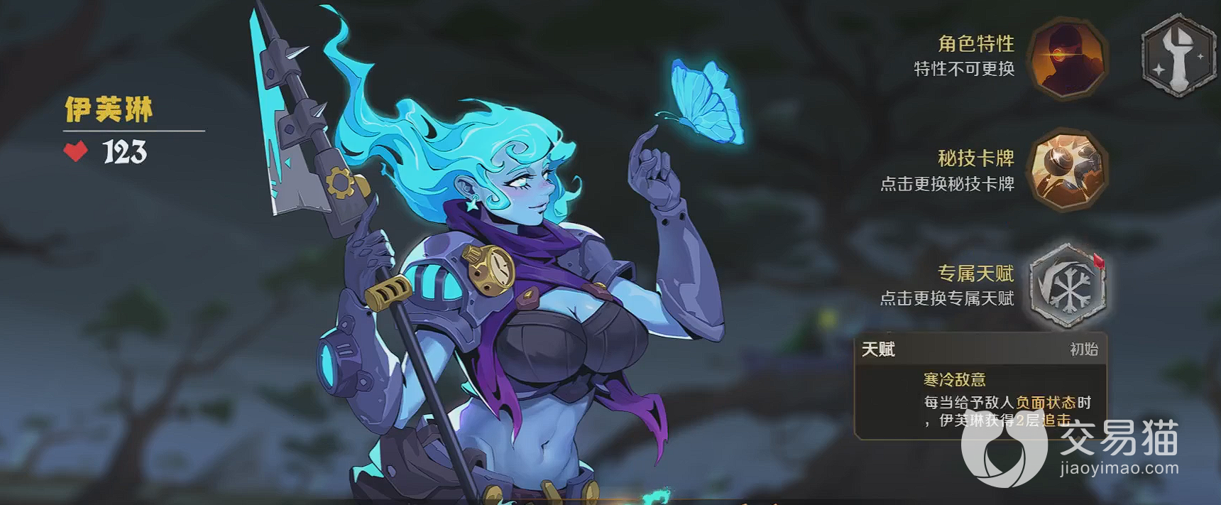 天赋方面的话,推荐各位玩家们选择她的寒冷敌意这个天赋。每当给予敌人一次负面状态的时候,伊芙琳会获得两层追击效果。该效果最好的状态下就是配合无限流卡牌,不断的给敌人上负面状态,哪怕是最弱的负面状态,只要叠加起来了,那么伊芙琳的追击属性就会越来越高,以达到击杀的目的。