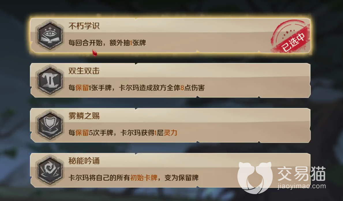天赋方面,比较推荐各位玩家们选择不朽学识。他可以在玩家们每回合开始的时候额外抽一张牌,获得更多的资源。其他的天赋方面,保留的话,不一定能保证该角色之后能拿到保留的牌,导致对局不太稳定。不过,如果作为伙伴的话,就不用顾及那么多了,放心大胆用就好。