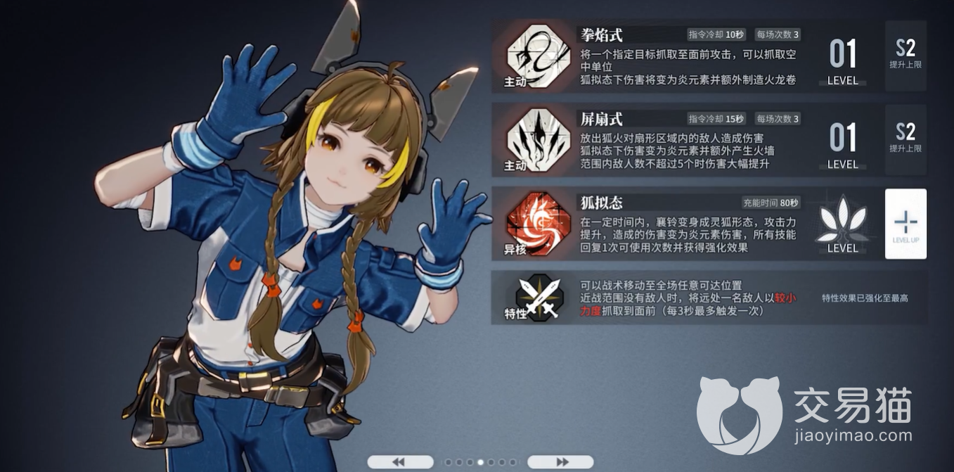 异核技能【狐拟态】可以让襄铃在实战中转化成灵狐的形态,在灵狐形态下襄铃物理攻击变成炎元素伤害,技能伤害获得强化,技能可用次数立刻刷新一次。特性【狐引】的时候襄铃可以在场上自由移动,周围没有敌人的情况下,可以强行牵引一名敌方单位到身边。