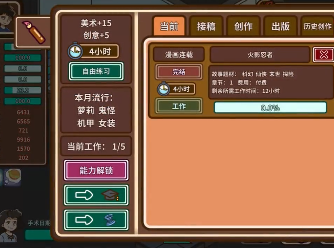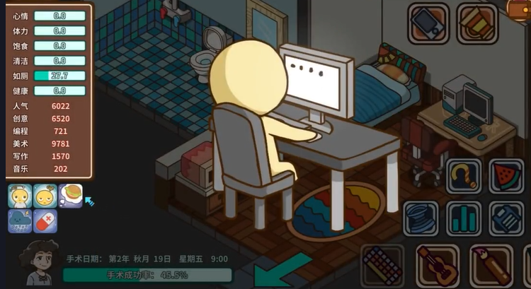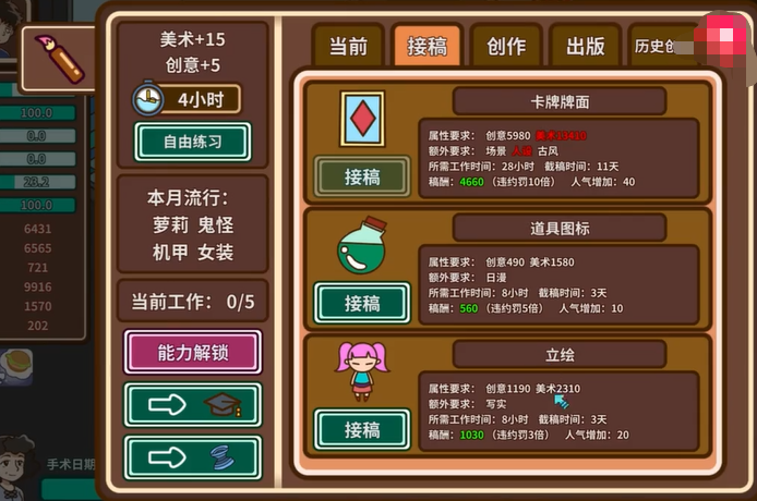 游戏中有各种指标需要玩家们去达成,比如说写作时间太久了,游戏中的角色心情可能会不太好,而且还有生病的风险,还有体力值跟清洁度,玩家们需要根据数额去调整,十分有挑战性,小编都觉得十分有意思。玩家们在游戏中需要学习各项技能来赚到元子,赚钱来回馈家庭。