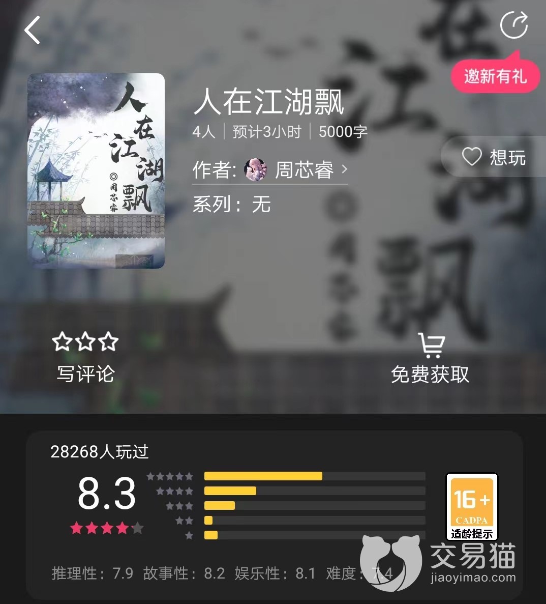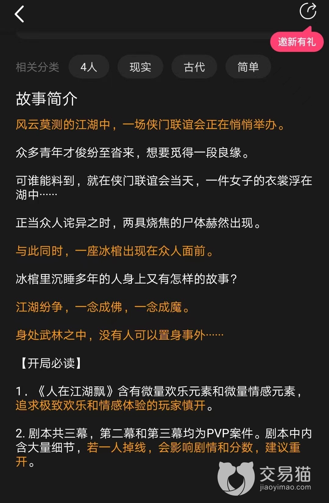 江湖之中总是会有很多的纠纷,这次的剧本就是讲述的江湖上的时间。不过这个剧本比较简单的4人本,是现代与古代之间的纠葛。那么百变大侦探人在江湖飘答案是什么,在江湖中一场武侠联谊会正在悄悄的的举办,各路青年才俊纷至沓来想要获得一段良缘,但是就在这天发生了离奇事件,这次时间的真凶是谁,那就一起来看下。