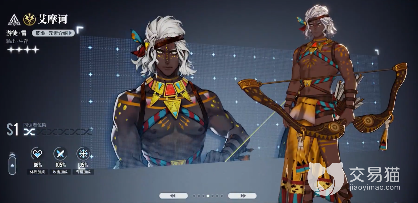 艾摩诃——该角色在游戏内定位是输出生存类型的游徒角色,他的特性在升级之后可以提升自身的攻击伤害,并且他的普攻可以分裂成多支箭矢攻击对方,自动技能属于一个范围性的多段伤害,主动技能让艾摩诃在战斗中不会被优先攻击并会进行自身回复,该技能保证了他自身的输出空间和生存能力,异核技能就是一个简单的范围性雷元素伤害,比较特别的就是可以破坏掉建筑。