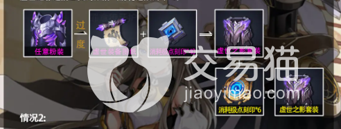 小编现在给大家带来装备上的选择,也是需要一步步过渡来使用的,首先玩家们需要先拥有任意一个粉色护甲,在通过虚世装备加极点刻印40点来升级成虚世之影套装,在深渊55级毕业套装不见纯白深渊之礼服,在使用史诗碎片直至进化出无齿暗魂套装。
