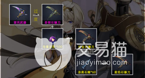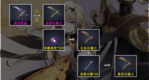 玩家们在初始可以选择首冲装备过渡到幻金石镰刀,需要消耗圣银石镰刀加上导模资源500个,等达到一定等级后可以使用幻金石镰刀加漆黑石雕60个升级成星焰石镰刀,以上这种是没有转职的情况,可以先使用基础的过渡,如果转职后可以选择使用首冲镰刀过渡到霞光镰刀,在达到一定等级后使用漆黑浮雕转换成霞光之赫瑞。