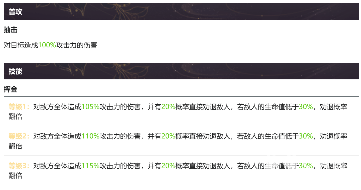 鲁肃:作为输出,他可以造成大量的群体伤害,并且有几率使敌人陷入混乱状态,打断敌人的技能。他的大招可以劝降敌人,减少敌人数量。建议放在二号位,有攻击加成。具体值看下图: