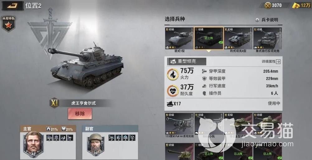 超重坦克是苍狼阵营的一种特殊兵种,只有苍狼阵营有,它的移动速度很慢,但是却可以随着兵种的星数而增加,它的防御力在所有的坦克中都是数一数二的,它的防御力很强,可以抵挡大炮之类的攻击,因为它的防御力很强,所以它很惧怕高穿透的兵种,比如反坦克炮。