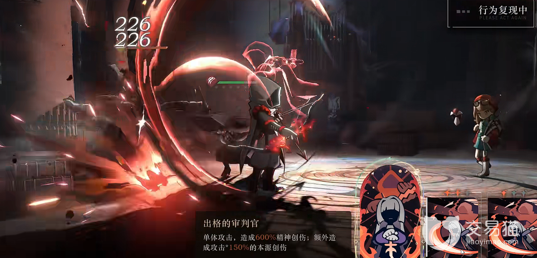 大招技能,高倍率精神伤害的单体输出技能。与基础攻击技能一样,对其造成额外的精神创伤的同时,还额外造成当前攻击力100%的本源创伤,对boss专用。且基础倍率很高,配合上自身的被动效果,在敌方生命值低于自身的时候,攻击力提升15%,相当于一个小斩杀。