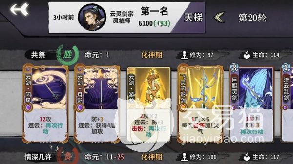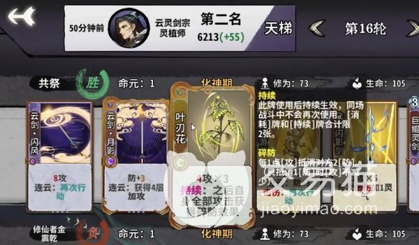 化神期卡牌:这个卡牌有三张,第一张成长可以将角色的生命上限永久增加一点,第二张的效果是升级一张一级的卡牌,第三个牌能够让角色触发一次道韵预感。