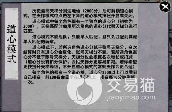 该模式下是不能进行组队的,大家只能独自游戏,然后匹配到其他独自游戏的玩家,在该模式中大家的道心分要是比天梯分低的话,结算时候只有道心分会产生一定的改变,而天梯分则不会。要是道心比天梯分高的话,天梯分会随之增加或者减少。而且在这个模式下,道心分是没有扣分保护机制的,因此大家要想提升天梯等级的话,该模式不太建议大家开启哦。