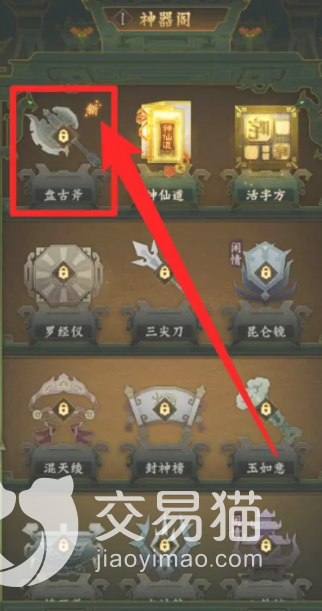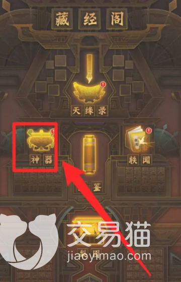 进入藏经阁后,大家会跳转到一个拥有五个选项的界面,其中就有一个叫做神器的选项,这个选项就是各角色神器的所在地,大家只需要点击神器就可以。之后进入神器页面就能看到各角色的专属神器了,这些神器有三尖刀、昆仑镜、玉如意等等,不过大家看到的这些神器都会处于未解锁状态,这个状态下是无法装备的。