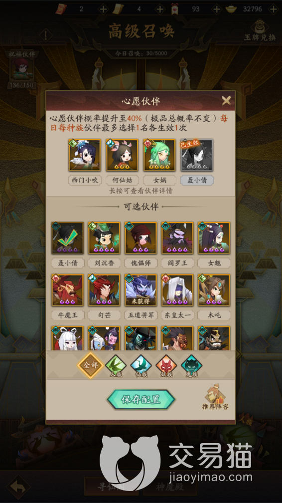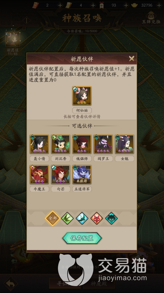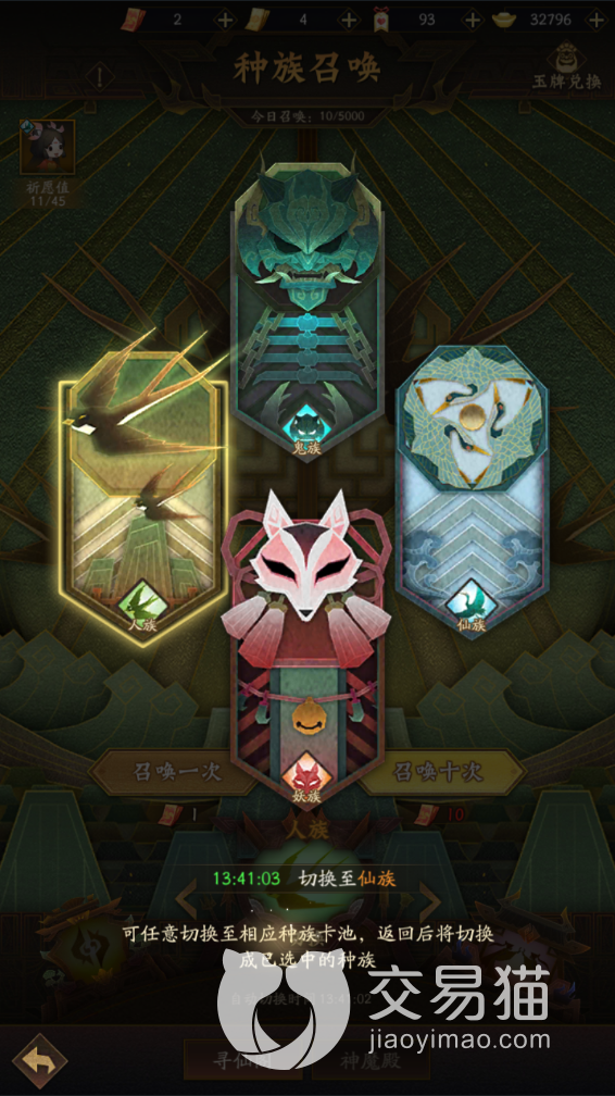 只要是设定成心愿的那个角色,后面可以抽取出来的概率就会更高,并且在保底的时候是必出其中一个的。而在这个界面会有切换种族的功能,不同的角色会有自己对应的族群,这里的麒麟就属于妖族,所以你们也可以在那里进行召唤。
