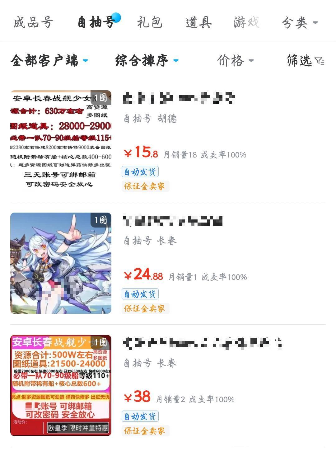 当小伙伴们搜索下载好交易猫之后可以在交易猫平台上找到放大镜去搜索战舰少女r游戏的资源号了,不过要注意在平台里资源号是被叫做自抽号的所以小伙伴们要注意搜索游戏之后在战舰少女r游戏里点击自抽号的板块。小伙伴们在寻找战舰少女r自抽号的时候可以看看哪些商品是有比较多的小伙伴选择的,给自己一个参考。