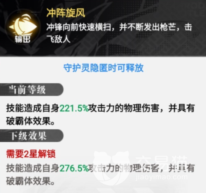 隐匿模式下,花木兰的技能是【冲阵旋风】、【狂龙卷】和【巾帼须眉】,这些都是需要我们伺机放出,并且cd也比较长。而【冲阵旋风】是一种向前冲击并aoe线路上敌人的技能,可以打出基于自身攻击最高276.5%的物理伤害,甚至能破霸体,还能打断敌人的技能。