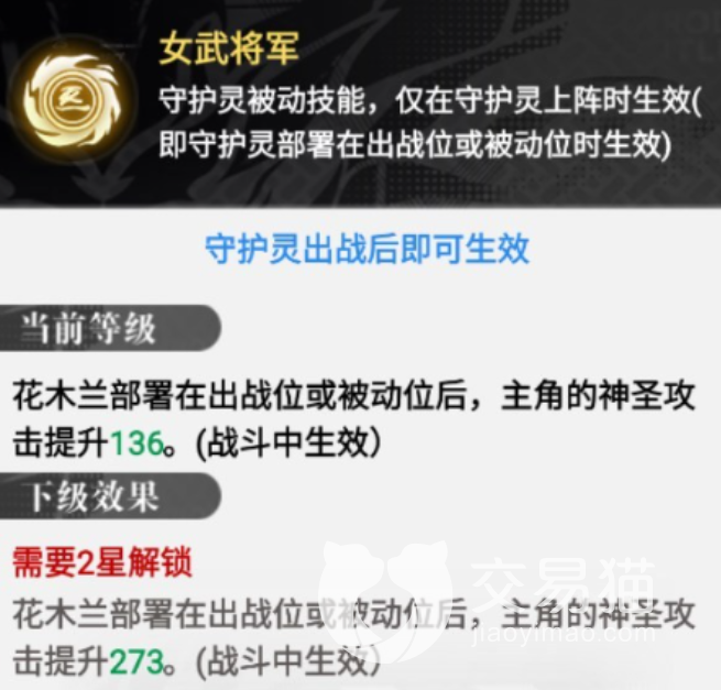 除了这些主动之外,花木兰也拥有俩被动,分别是:【女武将军】和【强者愈强】。【女武将军】是一个无论在出战位还是被动位都可以生效的技能,可以给主角提供最高273点圣属性攻击值增加,有效拉高主角的输出能力。【强者愈强】需要我们把花木兰拉到出站位才能用,在花木兰进场的时候每一次攻击都必定能眩晕敌人,主角击杀敌人的时候花木兰得到伤害提升,增加花木兰的爆发力。