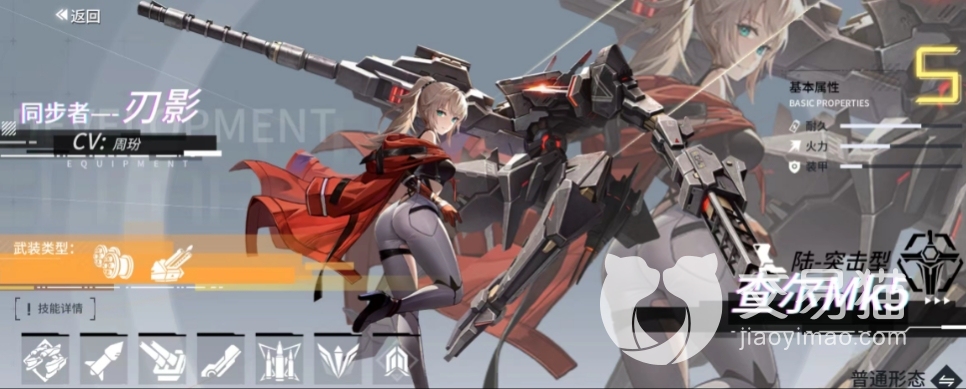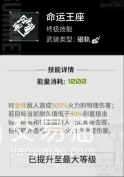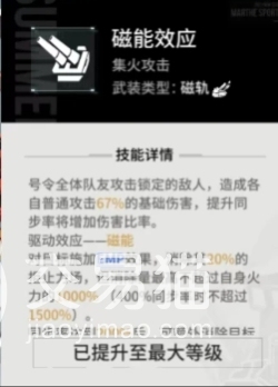 固有技能,叫乘胜追击,对锁定的目标会造成一次物理伤害,伴随耐力判定,它的标准是在耐力50%以下时造成400%的额外伤害。技能冷却时间为24秒。冷却时间确实相当长,但造成的额外伤害有利于快速收割。还有一个叫做磁能效应的技能,对于目标存在消除效果。和其他角色相比,它的被动技能狂热共鸣很特殊,每一级提升都会使自身火力值上升,输出的显著增强,因此他经常被用作核心。