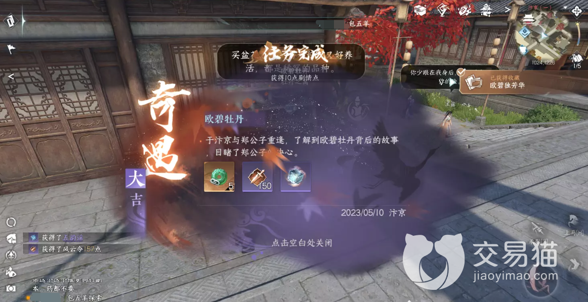 然后,你可以在汴京1026.1226找到苏晴,跟她对话后,就可以开始奇遇。在奇遇中,你会跟随郑训古去见欧碧壮丹,并了解他们之间的情感纠葛。最后,你会目睹郑训古为了欧碧壮丹而做出的决心。这个奇遇的奖励是纹玉(绑)5个、风云令157点、剧情点、一些心法、交子。