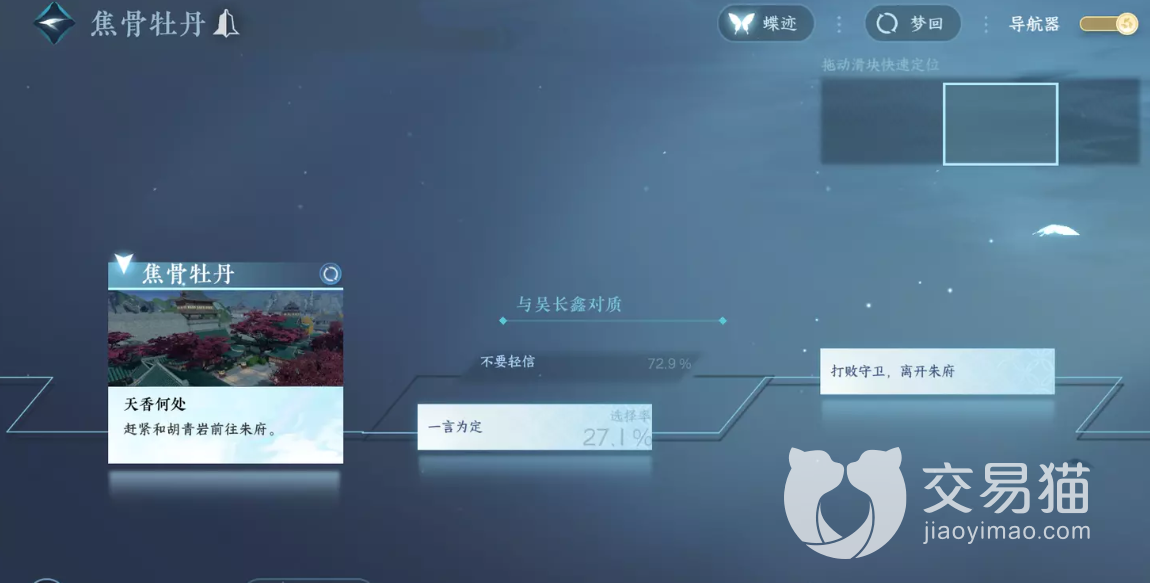 然后,你可以在杭州1226.1410找到朱肱,跟他对话后,就可以开始奇遇。在奇遇中,你会跟随朱肱去见郑训古,并了解他们之间的恩怨情仇。最后,你会目睹朱肱为了千叶牡丹而做出的牺牲,并见证郑训古父子之间的和解。这个方向的选择会给你差不多的奖励内容:玉(绑)5个、风令157、剧情点、一些心法、交子。