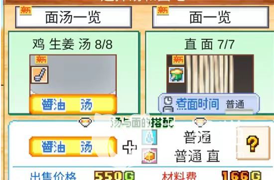 第二种是属性很高适合比赛应用的酱油面。面条所有时期都和第一种利润高酱油面相同。汤底用苹果、生姜、2大蒜、2砂糖、麻油加鸡汤。配料用8烤葱和红姜。