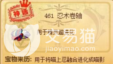 忍术卷轴是一种非常稀有和珍贵的道具,它的作用是让喵上忍进化成喵影。喵影是一只非常强大的风系精灵,它的属性、技能和特性都非常优秀。喵影的属性是风系和暗系,这意味着它对很多类型的精灵都有优势,而且也不怕很多类型的精灵。喵影的技能是狂风、暗影球、风刃和黑暗之力,这些技能都有很高的威力和命中率,而且还有一定的附加效果,比如减速、减防或者吸血。喵影的特性是迅捷,这个特性可以让它在战斗开始时提高自己的速度,从而先发制人。