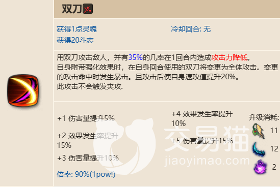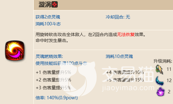 漩涡就是招牌技了,可以消耗斗志用大剑旋转打击全体敌方,高数值aoe(140%攻击),并造成无法恢复效果(2回合)。如果使用灵魂燃烧,那么可以在使用技能后立即获得满斗志。