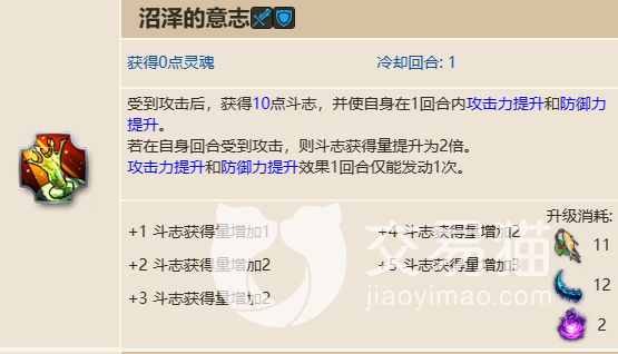沼泽的意志是她的被动技能,可以在受到攻击后提升自身的斗志(100)、攻防能力(根据血量)。而且倘若在己方回合被攻击到,斗志的获取量还会翻倍。