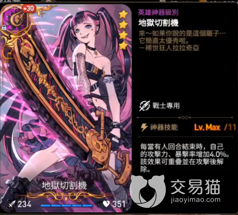 夏绿蒂的专属神器是双刀,可以提升她的生命值(具体数质根据角色不同等级的属性改变),并增加双刀造成攻击力降低效果的几率。