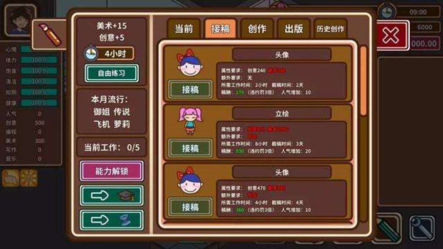 好的属性,可以为你的作品提升好的销量,自然赚得的钱财也会更多。小说漫画免费得阅读量是收取费用漫画阅读量得五倍,而阅读量和你的人气指数有很大关系,玩家的创意,完成的美术和自己的人气,都深深影响着你的销量和稿费。每个接单的工作都对创意属性有不同的要求,还有工作完成的时间,连载的时间都有规定。