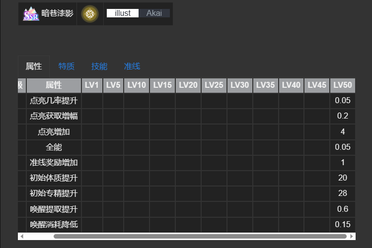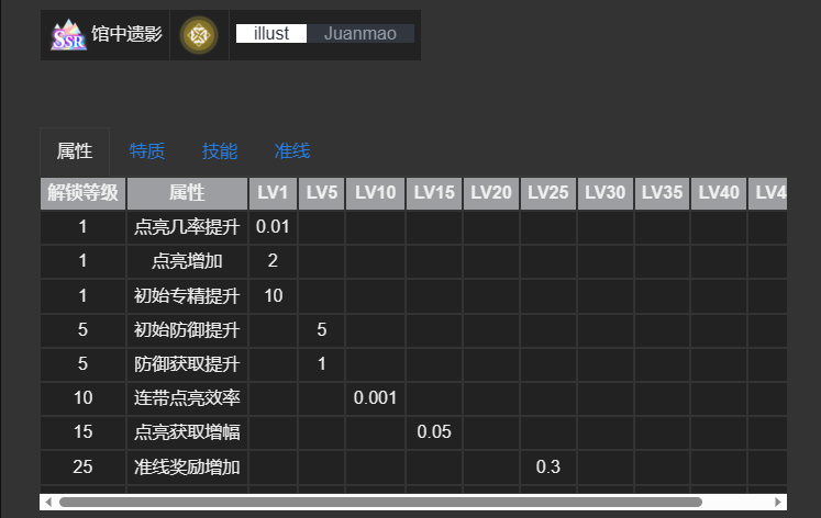 馆中遗影——该烙痕的属性分为多个等级解锁,一级时点亮几率增加0.01,点亮数增加2,角色初始专精数值增加10,烙痕等级5级时,角色初始防御数值增加5,防御获取增肌1,烙痕等级10级,增加0,001点连带点亮效率,烙痕15级时增加0.05点亮获取增幅,25级时增加0.3准线奖励。