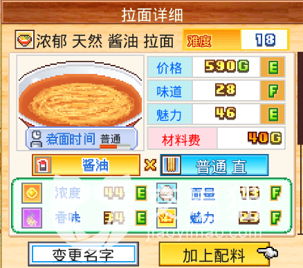 如果是不同色彩的组合,则会对所有的属性有不同的增益。所以在调配的过程中,一定要根据果汁的状况和材料的特性来进行调配,如果能够做到以上的搭配,那么就能够获得最佳的结果。虽然这个游戏的难度很大,但也挺有意思的,能让人感受到一种拉面的味道,也能让人了解到各种材料和汤汁的搭配之道。