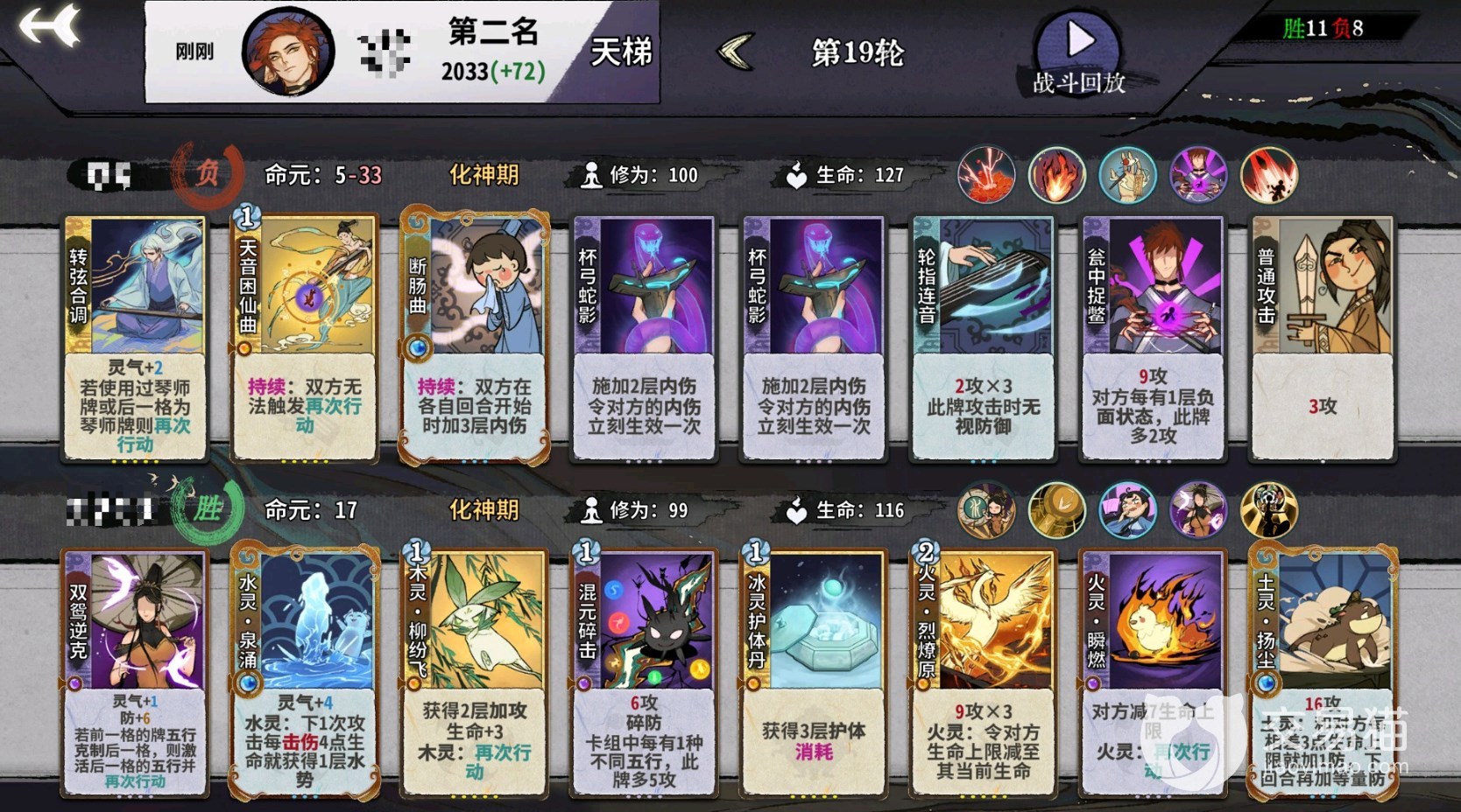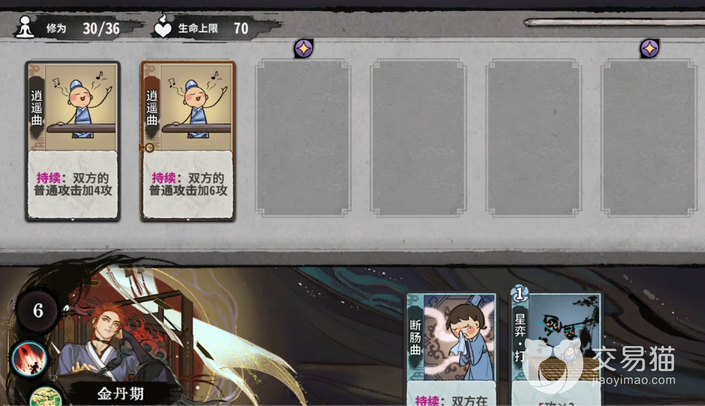 说到运营这一块,炼气筑基达到4d,留点机会给金丹,然后在金丹期尽量能换出来“断肠曲Lv.2”,当然如果有天赋“星蚀”的话,lv1的断肠曲也行。在游戏前期比如逍遥曲、慈念曲、土行曲、轮指连音这几张卡要留下来的,如果有“逍遥去曲Lv.2”那么直接全卖掉冲上“金丹D”也未尝不可。只有1级逍遥曲和慈念曲的时候则看情况来上定是否要上金丹了。到了金丹期,拿到断肠曲;到了元婴区拿到杯蛇、同心曲;最后化神拿到“转弦”。