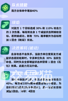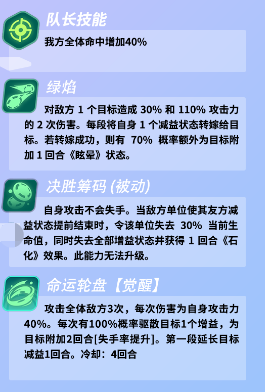 最后一个技能是命运轮盘,这样一个技能就是会攻击对面全体的成员3次,三次攻击中每一次都是会有40%的提升效果,如果有100%的概率,那么大家就可以将对面目标身上的一个增益效果给去掉,在去掉增益效果之后,还可以为它加上一个失手率的影响,在后面的两个回合中这个角色的失手率都会提升,第一阶段的时候会延长目标减益一个回合,他的觉醒技能也是冷却回合需要4个回合的技能。
