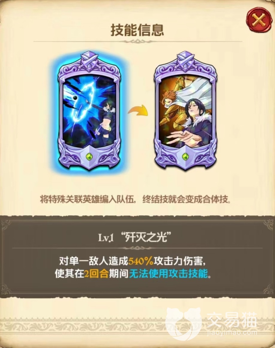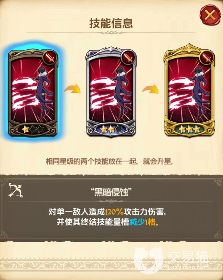 专属技能丰富的样品,对我方全体英雄在战斗时自动生效,使其终结技能量槽增加一格,能量槽增加也就意味着可以储存更多能量,虽然不是直接恢复能量效果,但是最终所能发挥出来的价值更高。第1个技能黑暗侵蚀,对选中单一目标造成伤害,并使其技能能量槽减少一格。当此技能升到三星之后,不仅攻击力大幅提升,能量槽能减少达到三格,这对敌方目标来说是很大的限制,几乎使其无法成功放出终极技能。