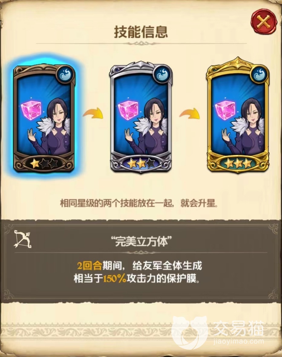 第2个完美立方体,使用之后,在两回合内为我方全体目标添加保护膜。初始保护膜只有150%攻击力数值强度,达到三星时提升到375%,再加上该角色自身资质好攻击力本来就高,所以这层保护膜能够起到很强的吸收伤害作用。再加上作用的目标是我方全体,所以最终强度极高。