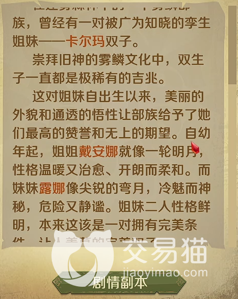 之后大家只需要在故事页面点击进入剧情就可以了,在进入剧情后大家会进入到迷雾森林中,在森林的部落中大家会看到一对孪生双子,作为双生子的她们对部落而言是吉兆,所以一开始她们是很受部落爱戴的,直到后来妹妹发生意外为止,到这里为止还只是剧情的前瞻铺垫,剧情还没有正式开始,只有看完这个铺垫后才能开始。