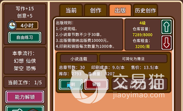 当玩家们的写的小说和画的漫画积累了一定的人气之后,玩家们的小说和漫画也有了一定的量,发在网上上架的作品就可以选择进行出版,出版的话出版方会给玩家结算一大笔的出版费,作品的出版之后网上的作品就没有了哦,而且这个出版是需要满足条件的,所以玩家们要注重前期人气的积累。