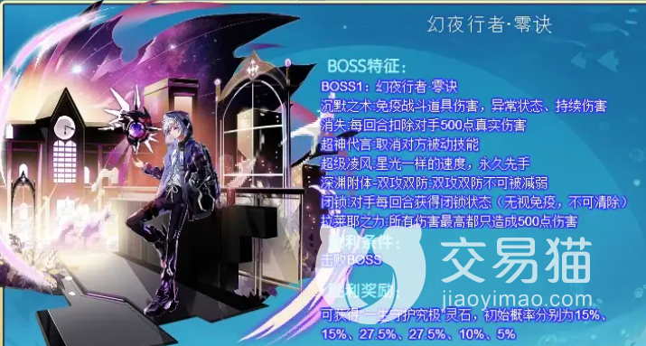 第一个玩家需要对战的是幻夜行者零诀。这个角色一技能沉默之术在游戏中是可以免疫战斗道具的持续伤害的,也就是说类似于中毒或者灼烧这样特效流的技能在这个人物身上不为适用。二技能消失,每回合固定对玩家造成500点的真实伤害,这个技能在多个回合中是固定且稳定的输出手段,想要打败这个BOSS玩家们就得注意尽量做到较短回合击败,因为玩家本身人物的血量就不多,如果说回合时间拖久了,500伤害很容易斩杀带走从而造成挑战失败。