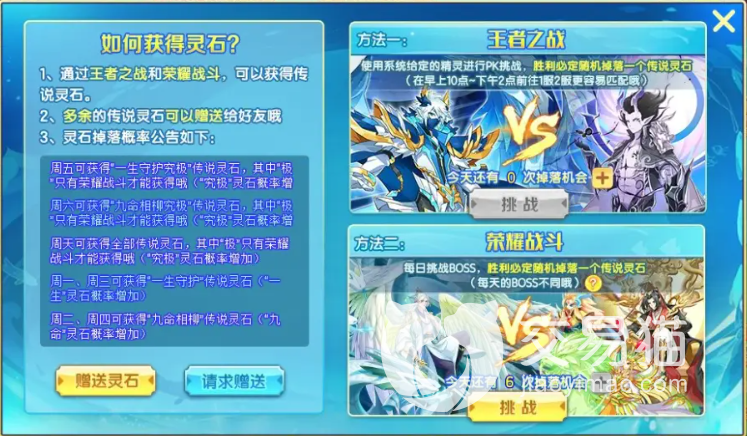 西普大陆九命相柳在游戏中伴随着更新上线了,玩家需要在获得灵石的同时探寻有关相柳背后的命运,而这获得灵石的过程就需要玩家们自行把握了。获取灵石在游戏中可以通过王者之战还有荣耀战斗获得,这两个活动都是游戏中的BOSS副本,需要玩家抓紧时间在特定的时间内和精灵挑战。例如说荣耀战斗在游戏之中是全天开放,而王者之战则是早上十点到下午的两点。