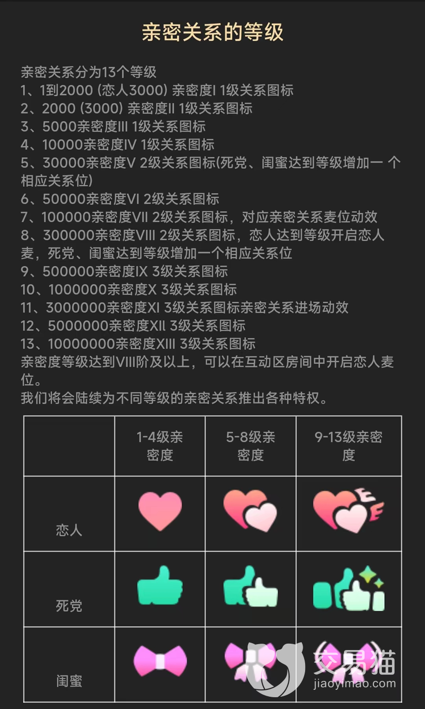 亲密关系也是有等级的,亲密关系等级越高,所展示的图标也越好看,而且如果亲密关系到达Ⅷ级以上,就可以在互动房间内开启百变大侦探的cp麦,陪伴麦的作用可多了,可以让cp感受彼此就在身边,可能打本也会更加轻松,推理也会更加的快速哦。