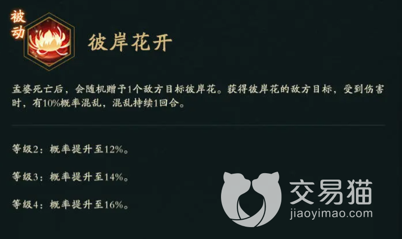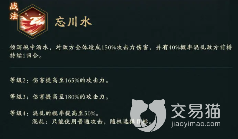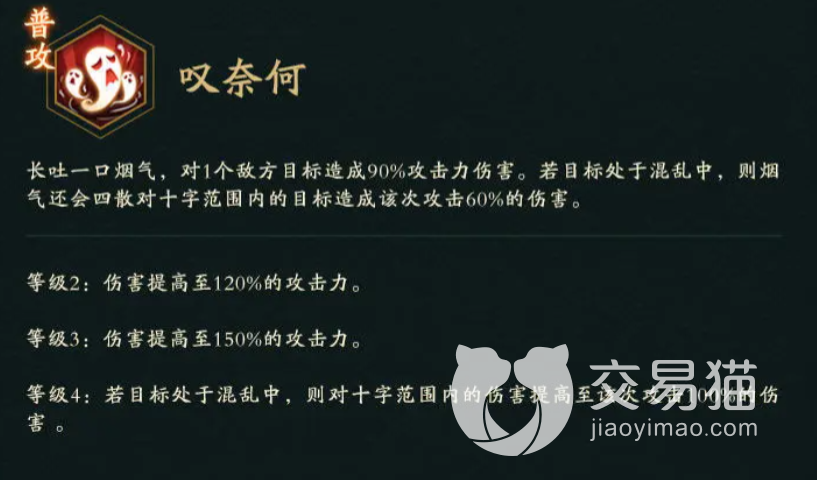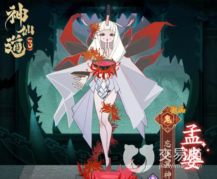 在身份定位上,她属于鬼族中的一员,在游戏中对方大招效果是将自己碗中的汤水洒出去,然后对敌方所有人都产生较高的伤害,中还会有40%的几率扰乱对面前排,这个效果会持续一个回合的时间。